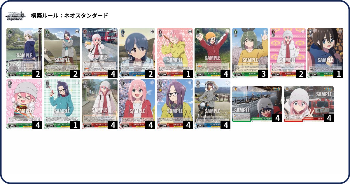 【WS】ゆるキャン△優勝デッキレシピ(Sydney Weiss Schwarz)【ヴァイスシュヴァルツ】 #WSdeckYRC 当サイトではアフィリエイト広告を利用して商品を紹介しています。 デッキレシピゆるキャン△ X Facebook コピー 2025.05.18 デッキレシピゆるキャン△ ヴァイスシュヴァルツの店舗大会で優勝したデッキやおすすめのデッキレシピを紹介します Weiβ Schwarz shop tournaments winner deck Yurucamp△【WS】優勝牌組 尤魯坎普△ ゆるキャン△のデッキを組むなら安くて在庫が豊富な遊々亭がおすすめです♪ 駿河屋遊々亭メルカリebay ブースターパック 『ゆるキャン△ SEASON3』 ブースターパック 『ゆるキャン△ SEASON3』を購入する。 駿河屋遊々亭Amazon楽天あみあみ トライアルデッキ 『ゆるキャン△ SEASON3』 トライアルデッキ 『ゆるキャン△ SEASON3』を購入する。 駿河屋遊々亭Amazon楽天あみあみ https://twitter.com/WSTops_Syd_AU/status/1915462856709190019 【ヴァイス】環境デッキ・優勝デッキ・おすすめデッキ・まとめ【WS|ヴァイスシュヴァルツ】 カテゴリから他のデッキも探せますよ!↓